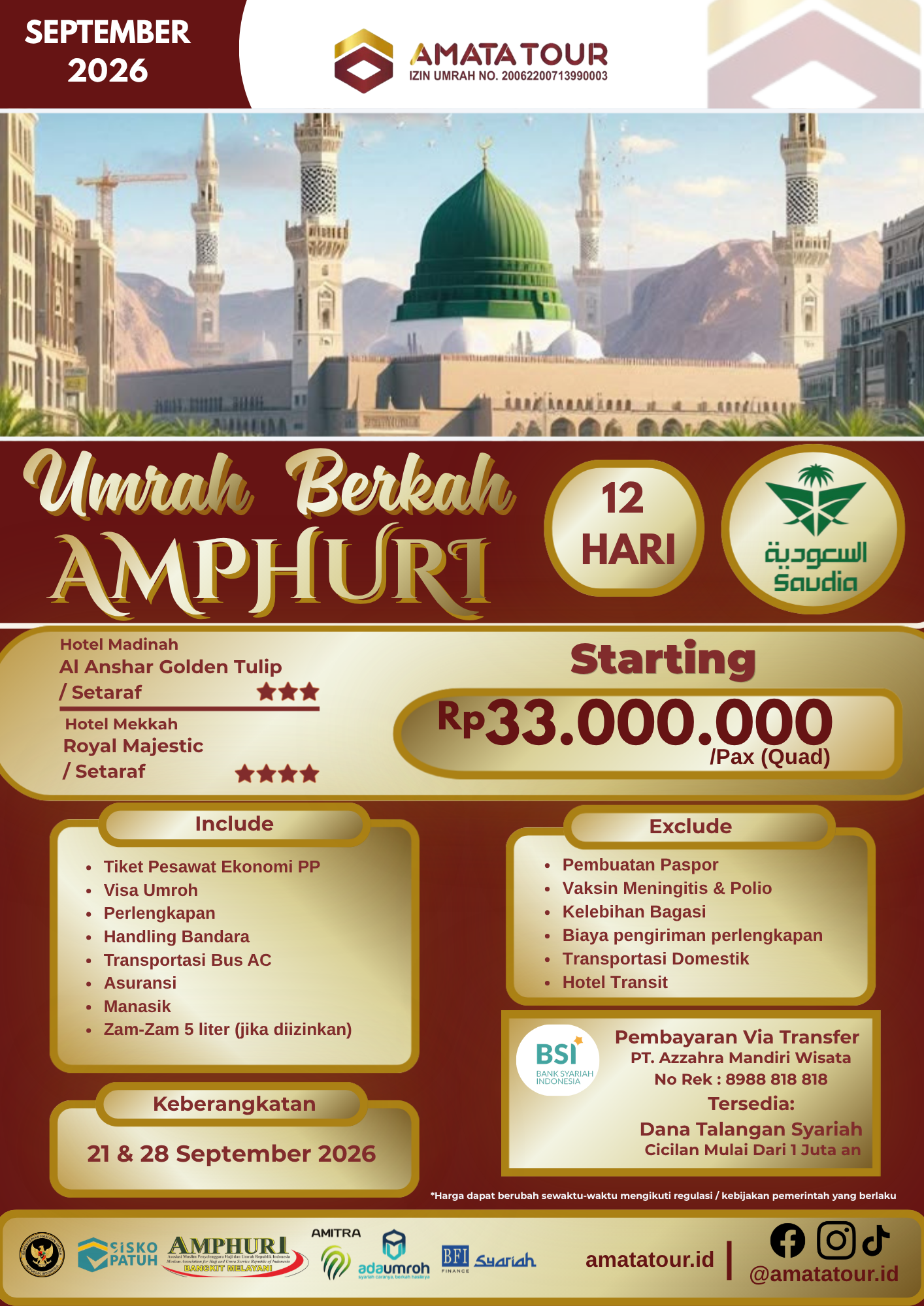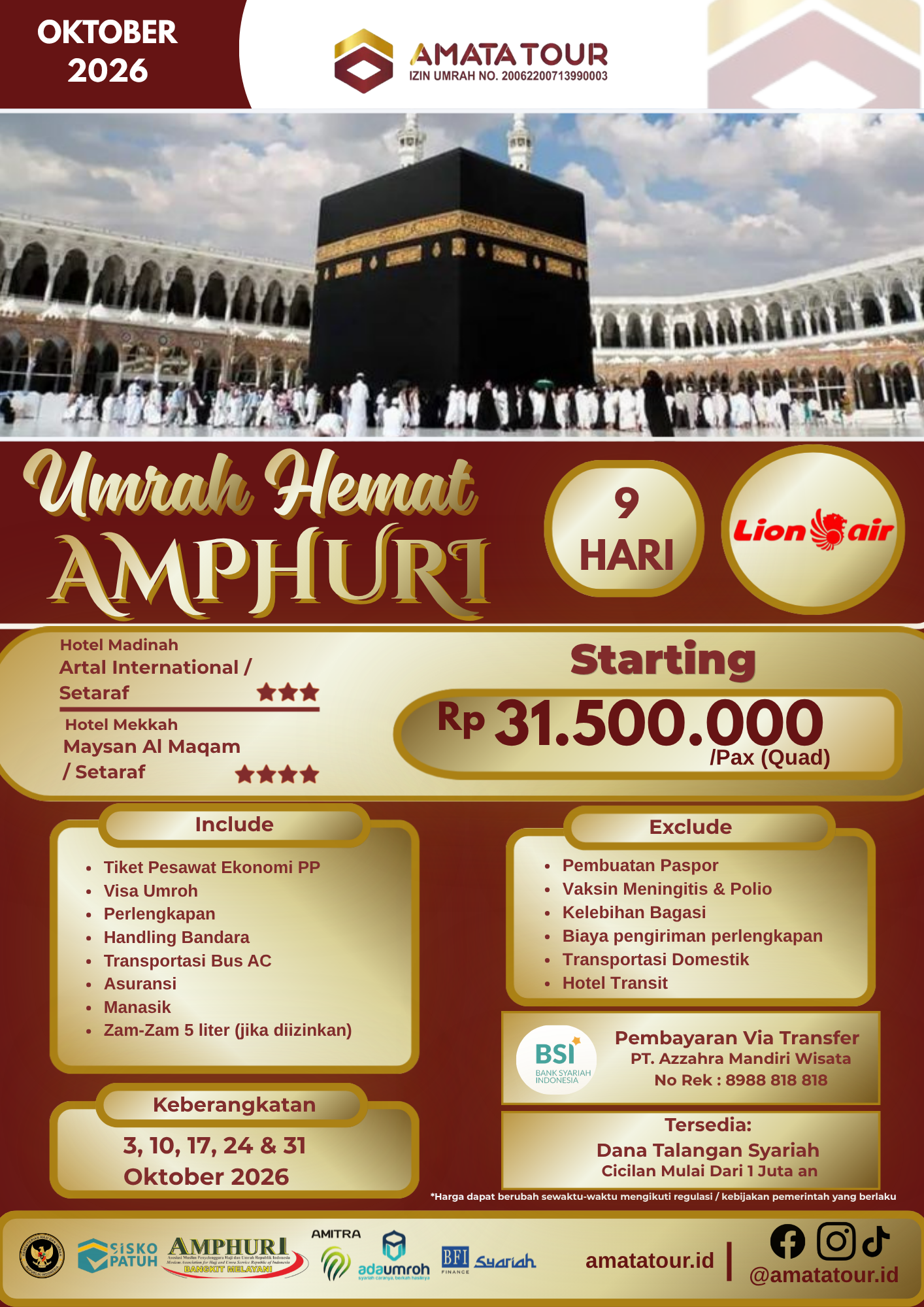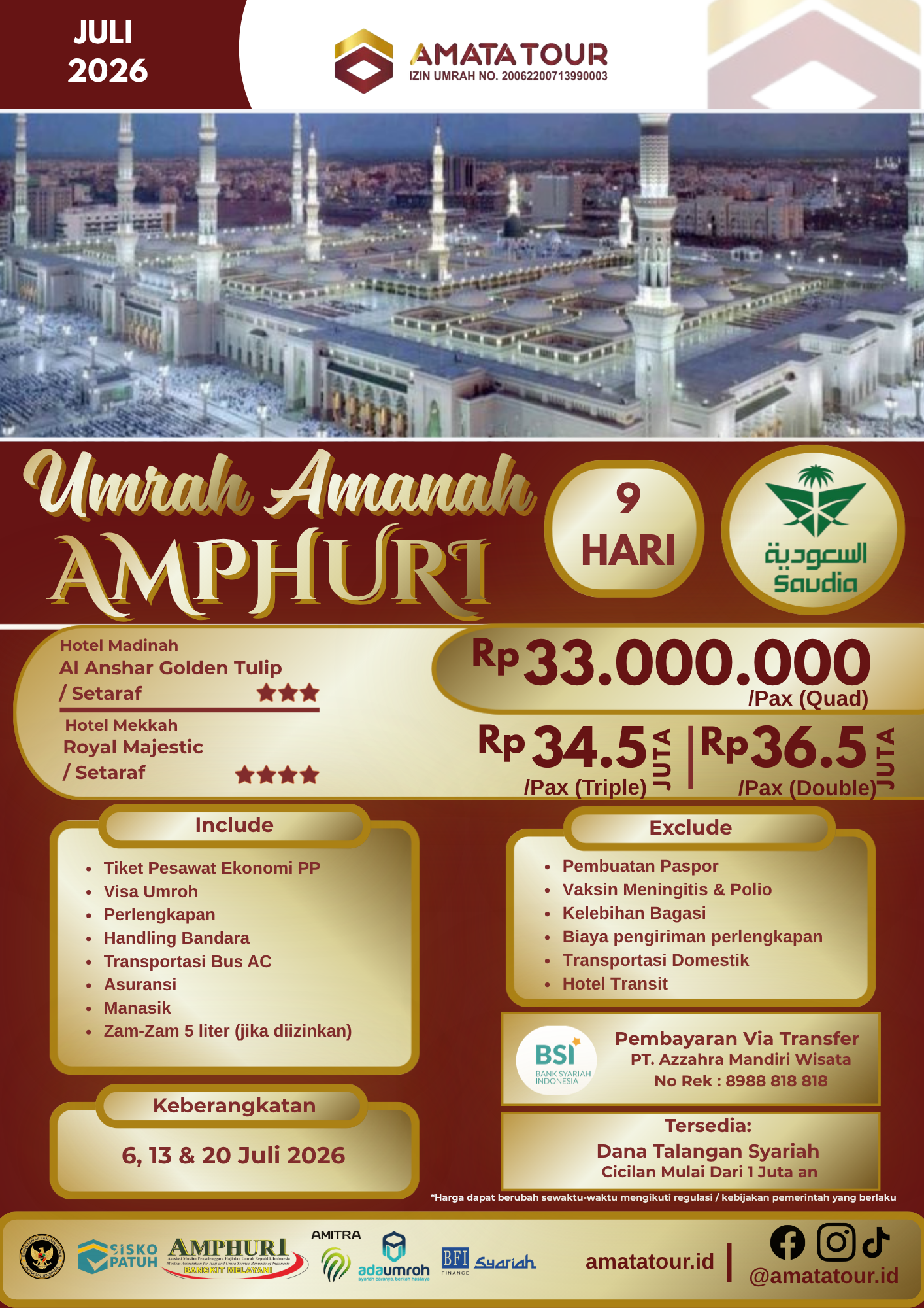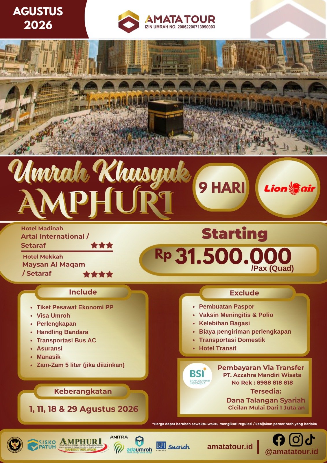 Amata Tour berizin resmi Kemenag PPIU No. 20062200713990006, Anggota AMPHURI KT-ALB 999-99080023, dan senantiasa tunduk pada peraturan dari pemerintah terkait